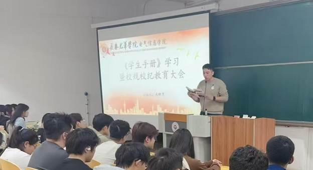 2025年10月11日,pg娱乐电子游戏官网入口在英华楼318教室开展“《学生手册》学习及校规校纪教育”专题讲座,2025级全体学生参加。辅导员关皓月系统解读了《学生手册》中的核心条款,重点围绕课堂纪律要求、宿舍安全管理、日常行为规范等与学生密切相关的校规校纪内容展开讲解。他结合真实案例进行分析说明,引导学生深刻理解各项规章制度的内涵与意义,增强规则意识和纪律观念,自觉规范自身行为,为成长为文明守纪的优秀大学生奠定坚实基础。