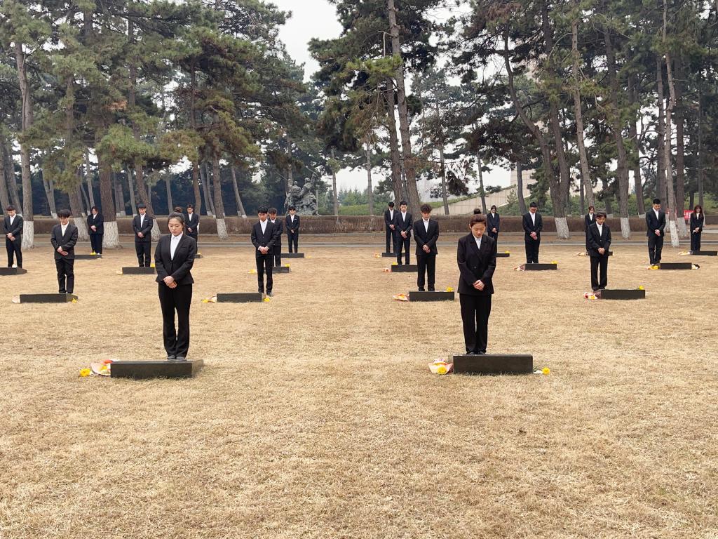 活动伊始,全体同学排着整齐的队伍站在高耸的烈士纪念碑前,向革命先辈们默哀、敬献鲜花,共同缅怀革命先烈们的丰功伟绩。接下来,大家来到烈士墓碑前,认真清扫擦拭墓碑,共同向战争年代为国捐躯的革命先烈们表达了崇高的敬意和无限的哀思。