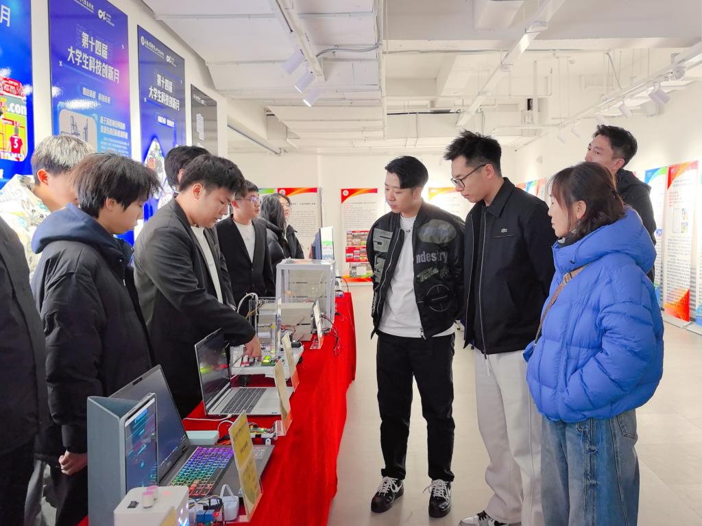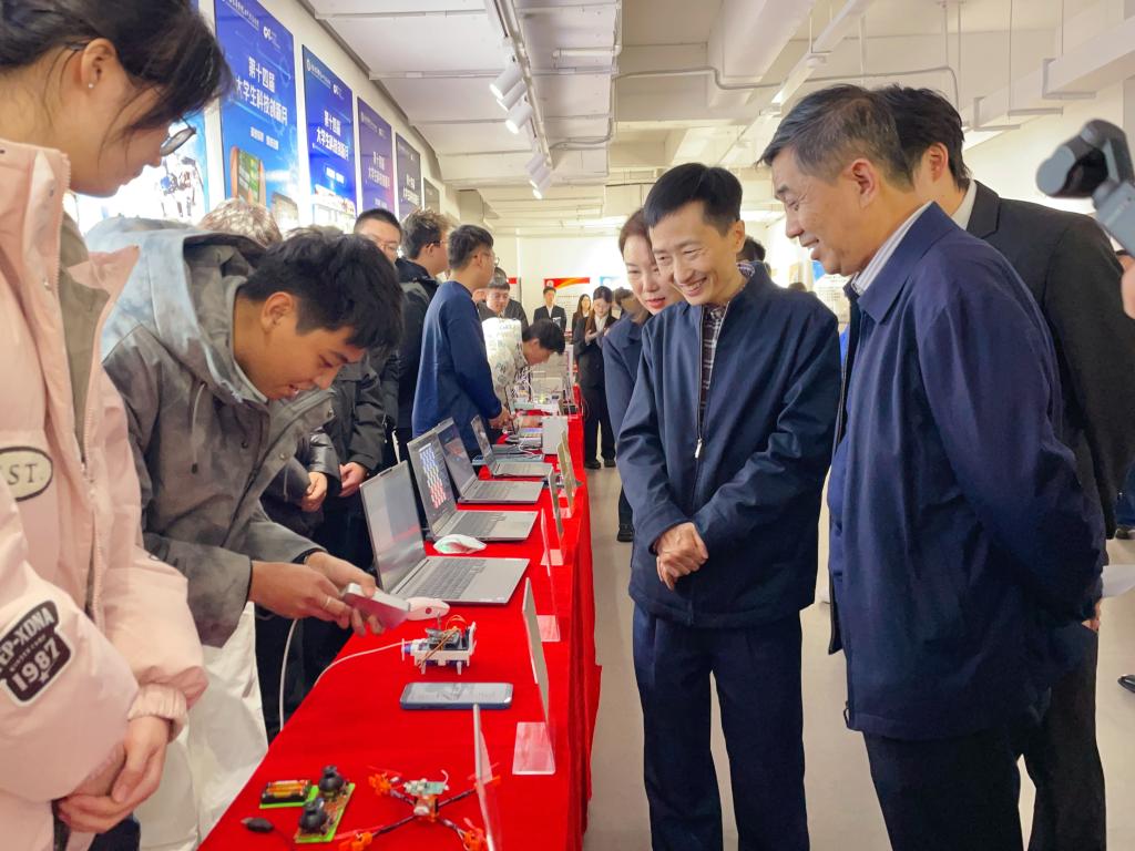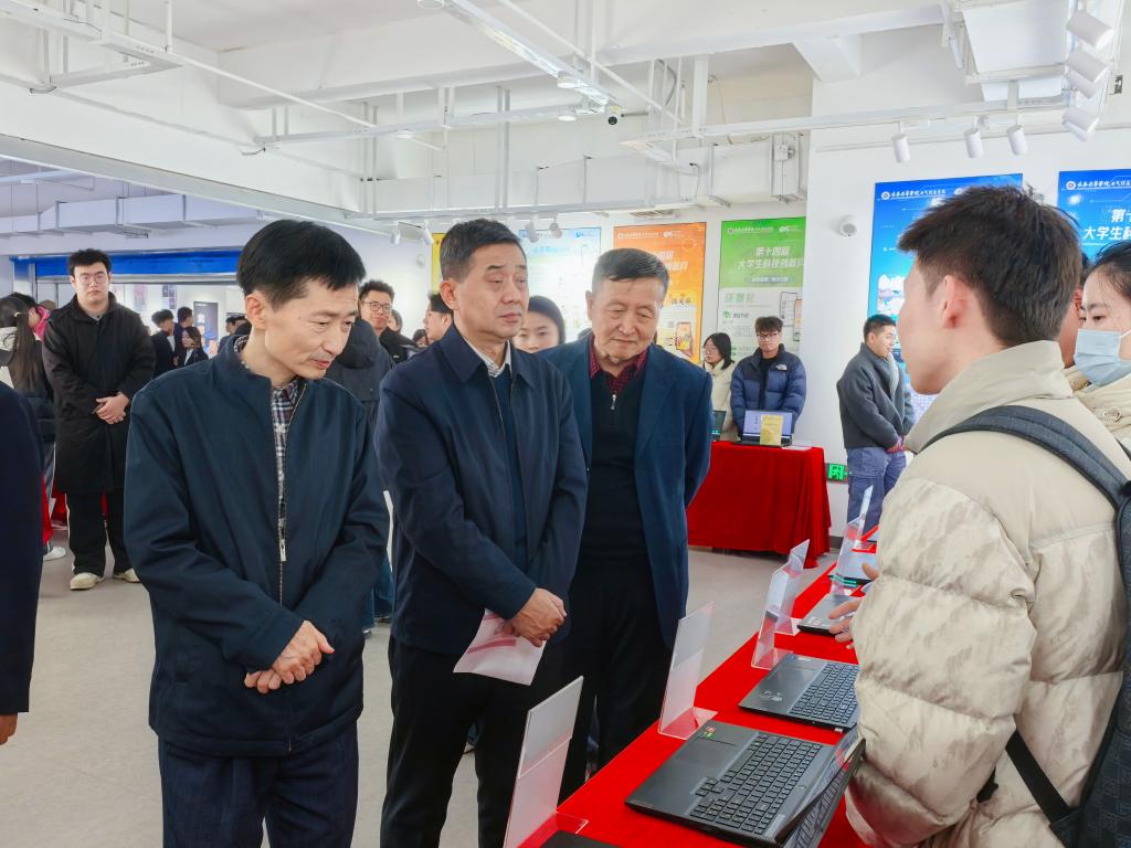 闭幕式结束后,校领导与师生一同前往科技作品展示区,参观了pg娱乐电子游戏官网入口科技作品展。获奖学生代表围绕作品的设计思路、功能特点及应用前景进行了现场讲解。校领导和老师们就技术实现路径、后续优化方向以及成果转化潜力等方面与同学们展开交流,并提出了建设性意见。