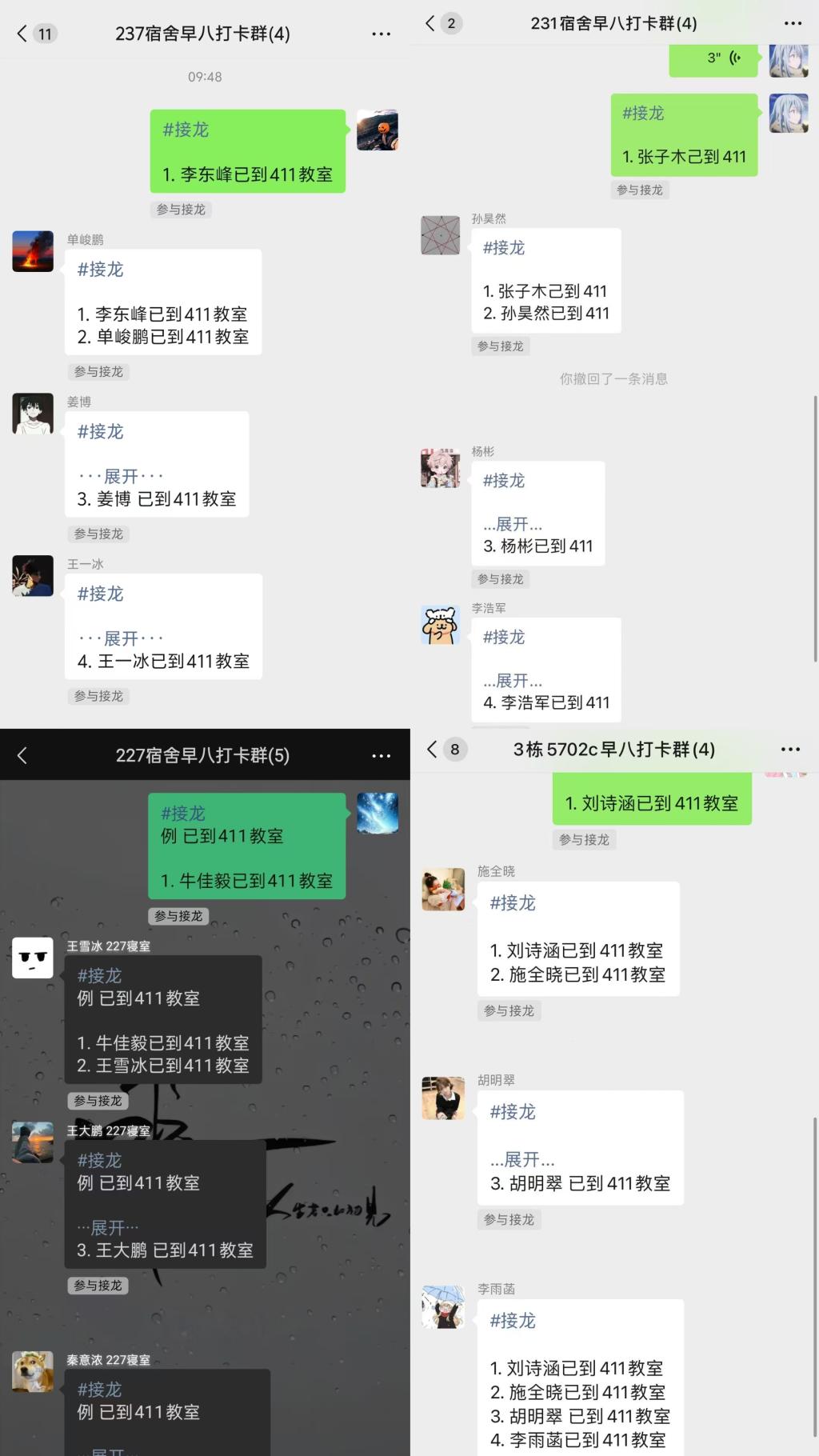 2025年5月6日-6月6日,pg娱乐电子游戏官网入口2024级同学们开展“早八打卡新机制,学风养成进行时”主题活动。活动中,各班级以寝室为单位组建打卡签到群,课前同学们在教室门口拍摄包含门牌的全员打卡照,实时上传至群内接龙。这种可视化的打卡模式,让“按时到课”从制度要求转化为自觉行动,为课堂学习筑牢纪律基石。