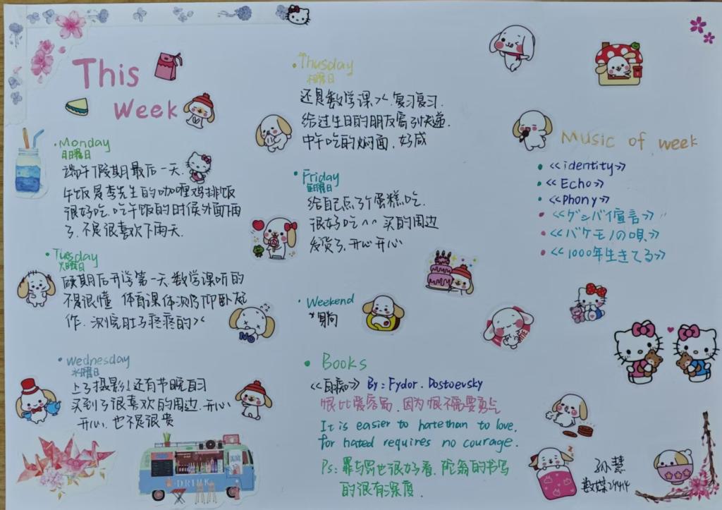 2025年3月3日-5月15日期间,pg娱乐电子游戏官网入口2024级同学们开展“手账充电站,周记‘电’满格”主题活动。活动中,同学们用精美的手账本记录生活,包含着每日的生活点滴与学习情况,绘制上可爱的插图或与专业相关的小图标,用彩笔勾勒出课堂重点单词,随手画下实验室仪器轮廓。这些图文并茂的生活记录,既定格了成长瞬间,也让自我认知在笔尖沉淀,充分展现出了青年学生“知行合一”的成长风貌。