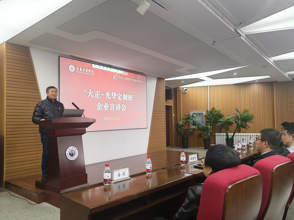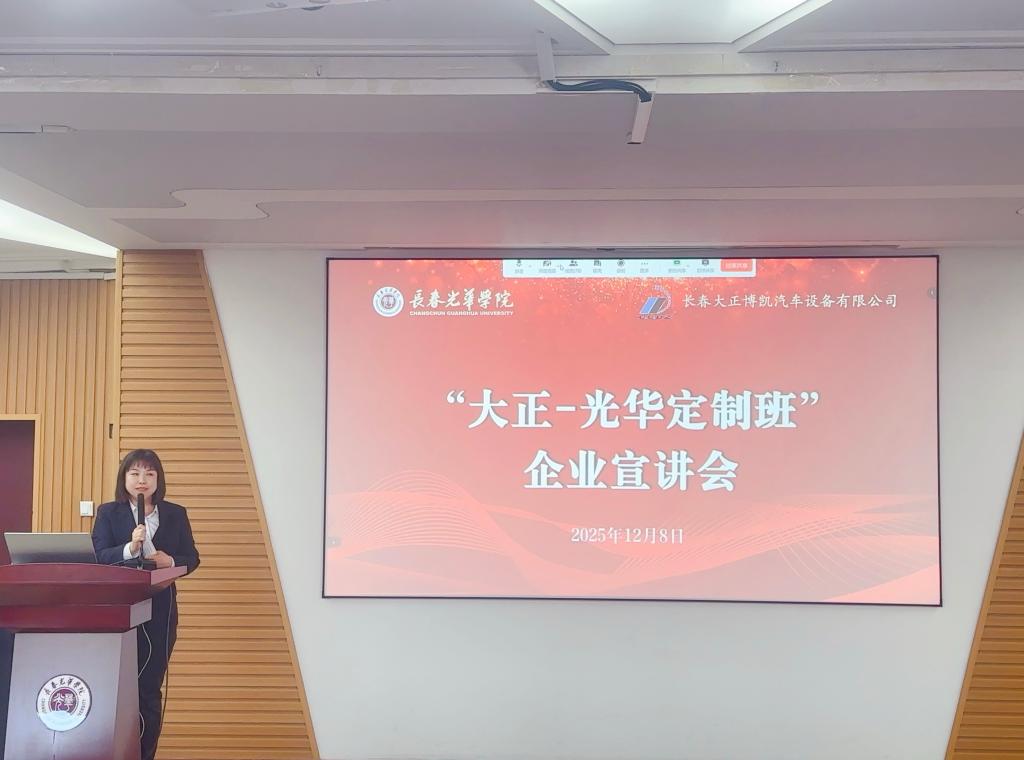 为深化产教融合、助力我省汽车产业发展,提升人才培养质量,进一步推动“大正-光华”定制班的建设工作,促进学生精准对口就业,2025年12月8日,pg娱乐与长春大正博凯汽车设备有限公司联合召开“大正-光华定制班”线上线下企业宣讲会。长春大正博凯汽车设备有限公司人力资源总经理刘春影、机械设计部经理单海东、仿真部经理刘晓娜、电气设计部经理张闯、人事主管葛艳,长春光华学院副校长栾学钢,机械工程学院院长杨卓娟、副院长姜波、副院长苗建伟、副书记王凯,pg娱乐电子游戏官网入口副书记李艳等领导出席。机械工程学院、pg娱乐电子游戏官网入口2026届全体毕业生及家长线上线下参加本次宣讲会。宣讲会由机械工程学院副院长姜波主持。