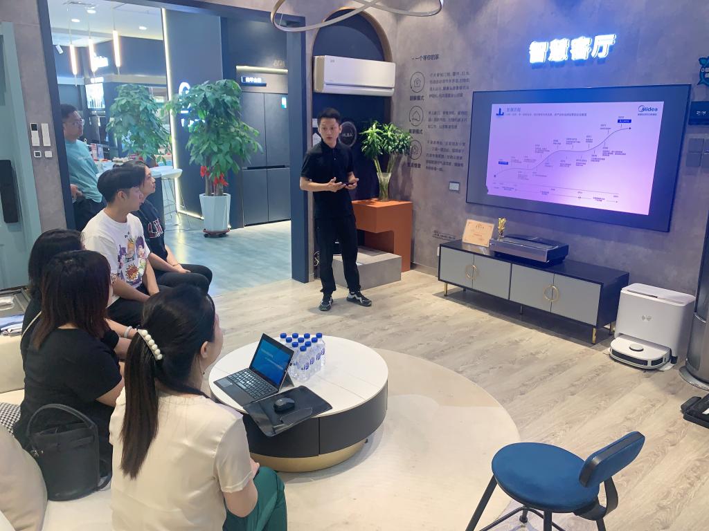 走访过程中,两位校友首先对学院领导和老师们的专程探访表示忠心感谢和热烈欢迎。接下来,在两位校友的带领下,大家分别参观了居然之家赛德店和美的智能展厅,校友李嘉和潘明鹤分别向大家介绍了各自企业的发展情况、公司组织架构以及用人需求等。随后,师生们一起座谈回忆着大学生活中的点滴趣事,分享着工作后的酸甜苦辣,两位校友也纷纷表达了对母校和老师们的感恩之情。最后,党总支副书记李艳对两位校友在工作中取得的成绩表示祝贺,对两位校友勇于拼搏、奋发有为的精神高度赞赏,同时,感谢两位校友一直以来对母校的关心和支持,希望两位校友能够对学校和学院的发展和建设提出宝贵意见和建议;希望两位校友能够积极参与校友活动,助力母校发展;希望两位校友能够在未来的工作和生活中秉持奋斗精神不懈努力,成就更好的自己。