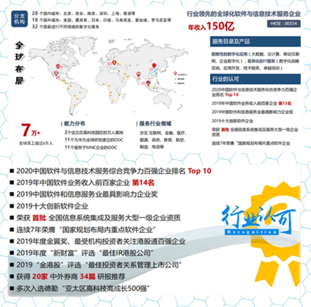 中软国际有限公司是中国领先的大型综合性软件与信息服务企业,成立于2000年其20余年的发展历程,始终站在行业技术和业务变军革的前沿位置,深刻理解不断变化的产业用人需求,坚持以提升从业人员的职业技能为己任,与全国千余所高校开展合作。在北京、广州、天津、重庆、西安、厦门等10多个城市建立了近20个人才培养基地,形成了年培养学生8万人次的规模这些学生绝大部分最终进入到包括中软国际在内的行业各企事业用人单位就业。全球权威IT研究与顾问咨询机构Gartner发布了最新《2021IT服务市场份额排名》,中软国际与华为、阿里、中国移动、腾讯、中国电信、中国联通7家中国企业再次一同跻身全球IT服务供应商市场份额TOP100